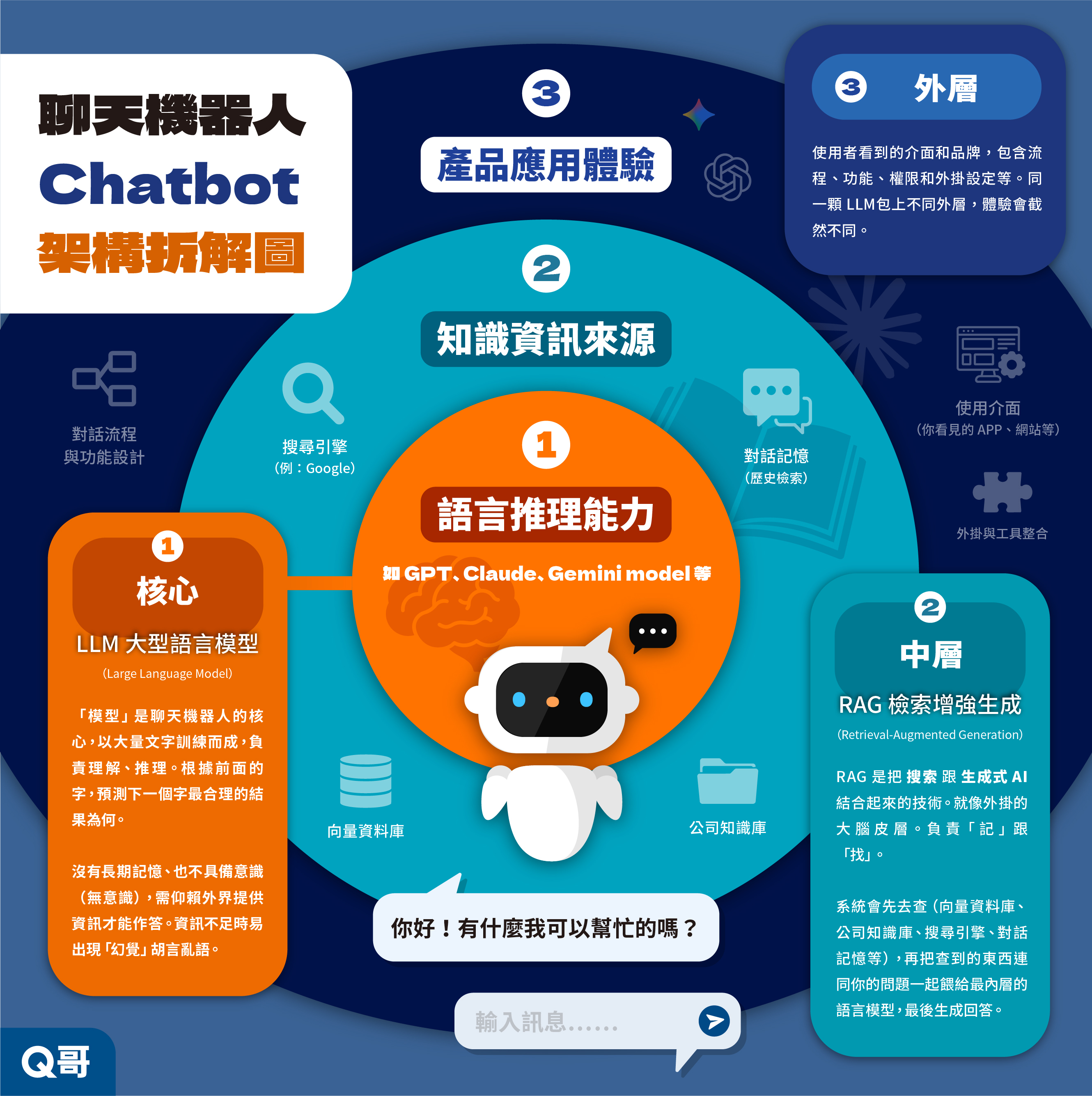 「模型」是聊天機器人的核心,以大量文字訓練而成,負責理解、推理。根據前面的字,計算出下一個字最合理的結果為何。