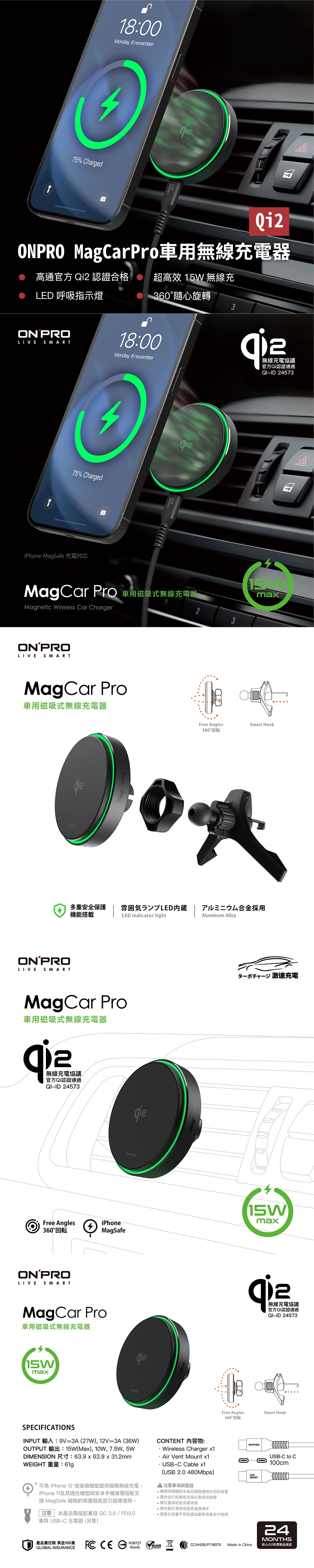 產品名稱:MagCar Pro qi2 車用磁吸充電器