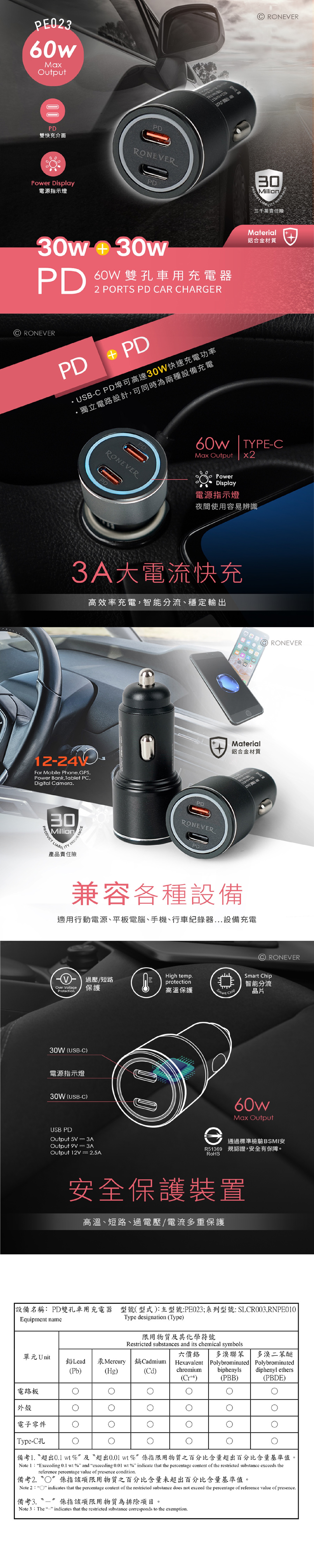 商品名稱:RONEVER 60W PD雙孔車用充電器組