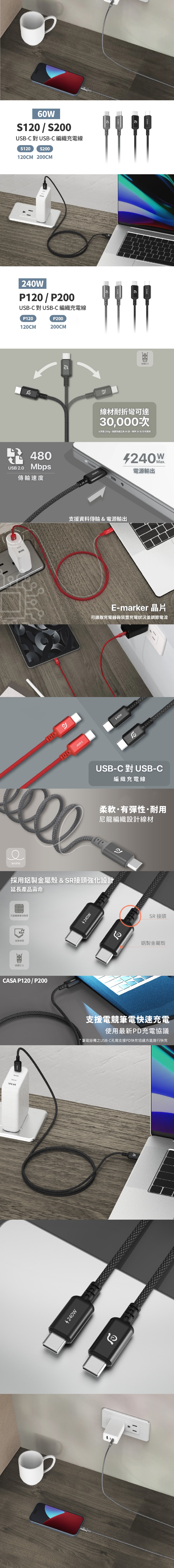 ✦ 可充電與資料傳輸,支援電源輸出:Max 240W(48V, 5A)/傳輸速度:USB 2.0, 480Mbps。