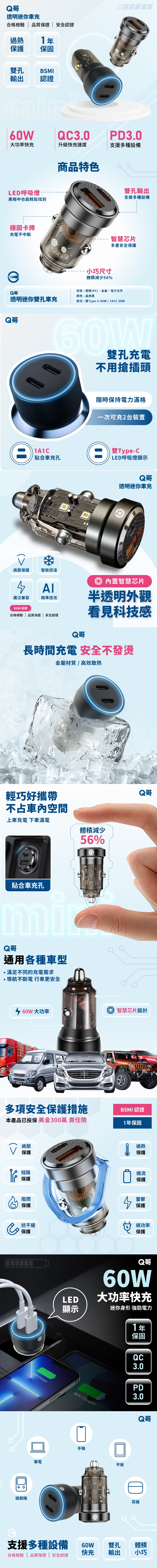 QKKC003【60W 雙Type-C 透明迷你雙孔車充】
