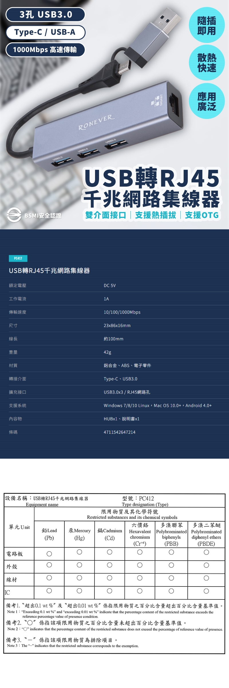 ✅3孔USB3.0擴充埠,具快速充電及傳輸功能,耗電量低。